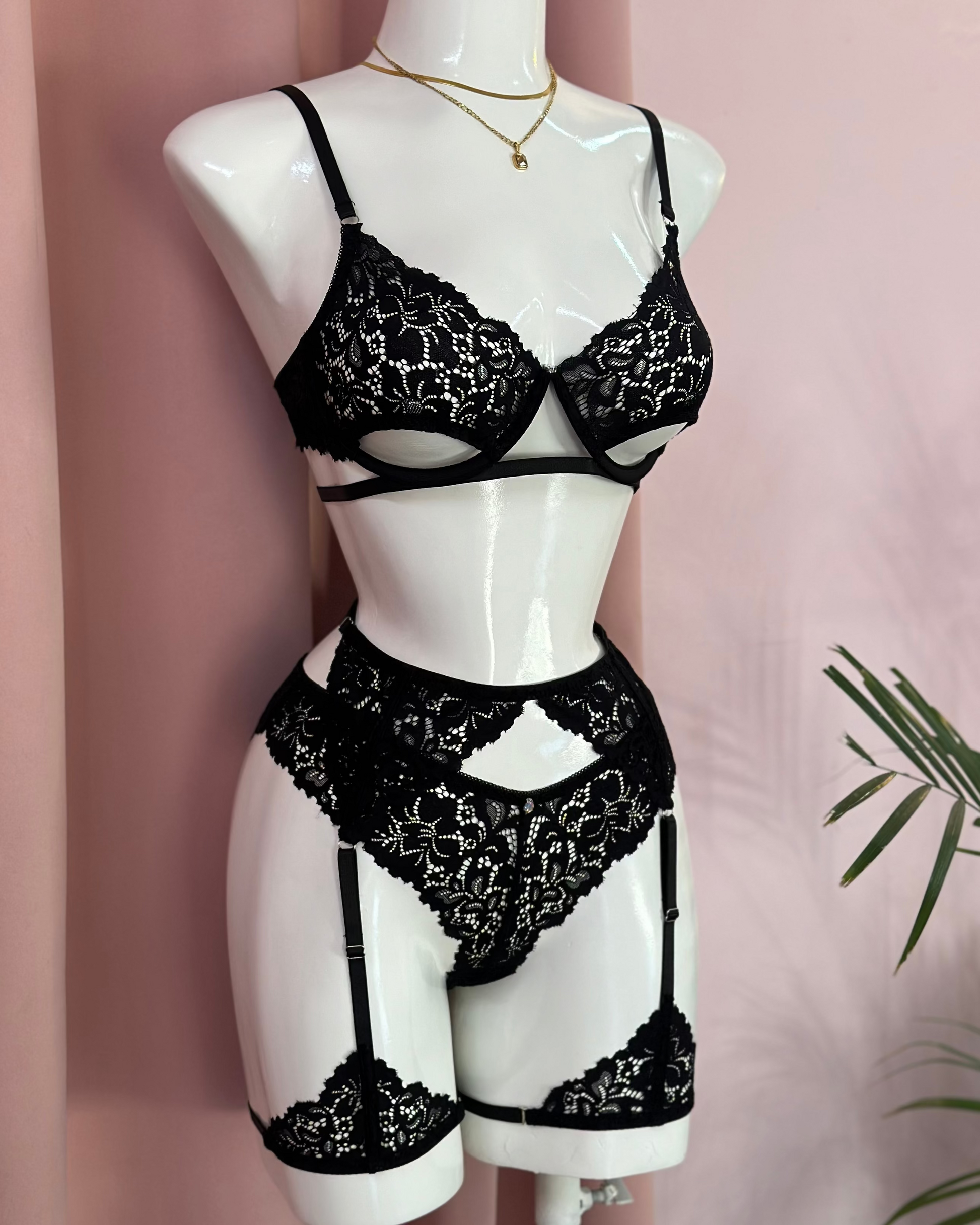 Set tres piezas con liguero y tiras ajustables.